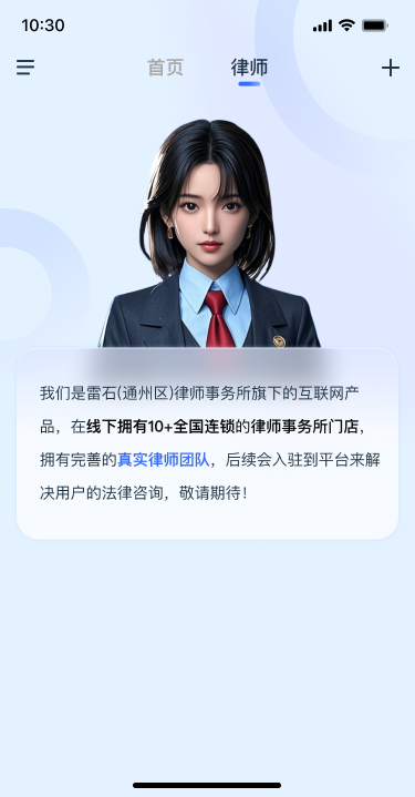 我们是雷石(通州区)律师事务所旗下的互联网产品,在线下拥有10+全国连锁的律师事务所门店,拥有完善的真实律师团队,后续会入驻到平台来解决用户的法律咨询,敬请期待!